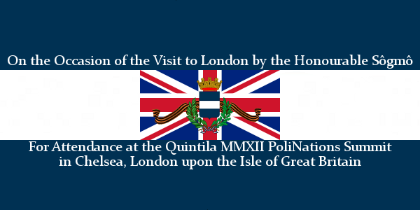 On XV G Quintilo, the Sôgmô cancelled a journey to the Crown Prince of Austenasia’s Church due to illness and fatigue, as the Sôgmô had been working non-stop since the delegation arrived on the past Wednesday. The Sôgmô did, however, continue on with a state visit to Austenasia and the Carshalton Sector and was the first Head of State to visit Austenasia for some time, though Premier Puchowski of Landashir did immediately follow in being the second. The Sôgmô, along with Premier Puchowski, Mme Caesar of Austenasia, M. Sutherland of Francisville, toured the Sector and then returned to London before meeting with the St.Charlian delegation and M. Tierney of Renasia. The group of micronationalists then travelled the embankment of the river Thames, saw the Shard, and passed Shakespeare’s Globe, before stopping at a Starbucks and arranging the GUM Quorum. A few matters were discussed, which shall be discussed in fuller detail this Sunday, and well-wishing and congratulatory motions passed to wish Sirocco a happy 10 years of existence and to thank the organisers of the MMXII PoliNations Summit. Both motions passed and the Quorum was adjourned before the group travelled further up the embankment of the Thames before coming to an Underground Station, where the group dissolved.