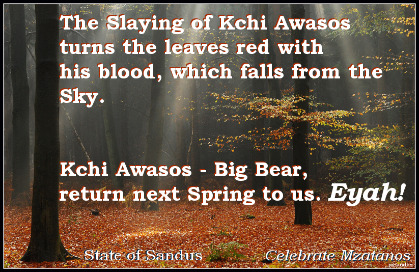 Sandus has made strides in its own self-creation for the expression of a culture synonymous or influenced by that of Native Americans. Sandum policy and most Sandum citizens believe in the autonomous and sovereign rights of indigenous peoples, and Native Americans are no different. Heavily influenced by the Sôgmô’s ancestry from the Western Abenaki, the State of Sandus has become a bastion of Native American cultural renaissance. Though efforts are being made to incorporate this with more Algonquin peoples and make it more broader in the sense of all Native Americans, the emphasis on the Abenaki remain; though the Abenaki and the Iroquois were enemies in the past, today both can be combined in this sense for the sake of the story of all Native Americans in Sandus.