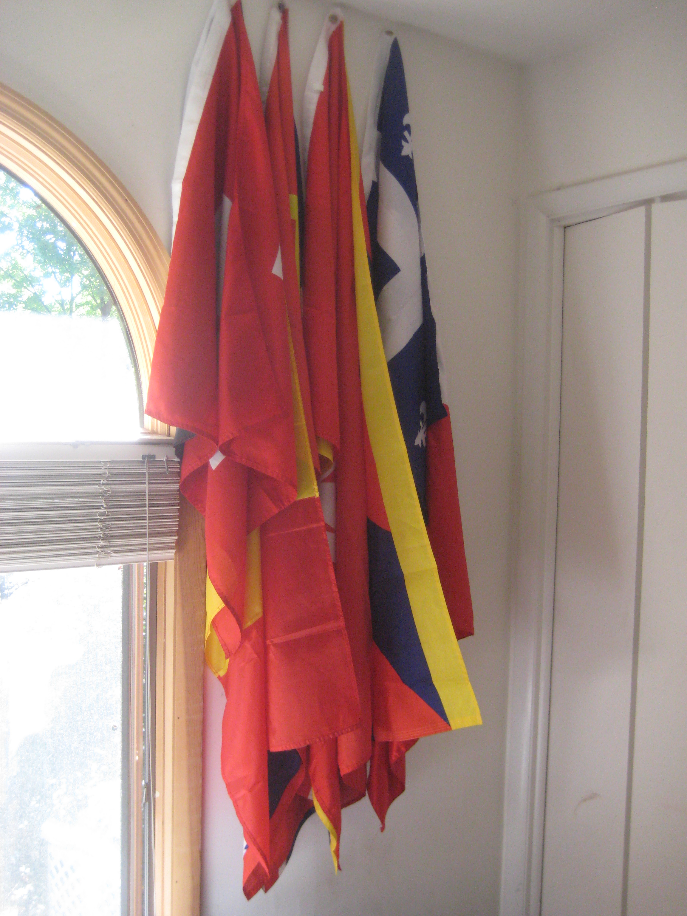 One of the oldest notable features of Sandus would be the Mur des Drapeaux in the Palace of State, Kremlum Sandus Province. Established by the then-Lama of the Grand Lamate of Sandefreistikhan, the now-Sôgmô has constantly changed and updated the Mur des Drapeaux to reflect upon the cultural influences of the outside world in on Sandus. Amongst the distinguished flags that bear an importance to Sandus are Germany, Belgium, Switzerland, the United Kingdom, Tunisia, the Soviet Union, Tibet, Maryland, France, and Québec; the State Flag of Sandus — added just a few months before — stands alone on its sole display, off to the side of all the flags.