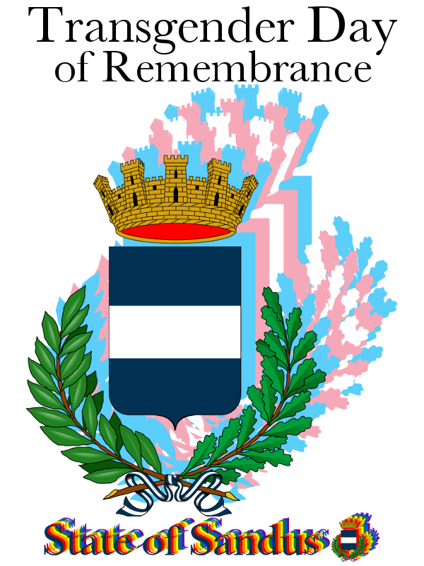 Transgender Day of Remembrance was marked here in the State of Sandus. The State of Sandus Facebook page was decorated for the day of recognition, which was placed onto the Sandum calendar back in Septembro (September) after Celebrate Bisexuality Day. Transgender Day of Recognition was begun in 1998 after the murder of Rita Hester, an African American transgender woman, in Allston, Massachusetts. Since 1998, Transgender Day of Remembrance has acted as a memorial for trans* people who have perished as a result of transphobia, including acts of violence inflicted upon them by others and acts of suicide.