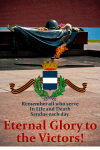 In an effort to mirror both the style used by Castelletti in 2010 and to differentiate Sandum art from others micronational forms of art, 2012’s propaganda posters reflect themes of order, bravery, courage, and sacrifice. Though emphasis is still placed on the Soviet Red Army, some pictures make more generic reference with subtle Soviet influence. The banner poster depicting the Sandum coat of arms with the St. George’s ribbon in front of the eternal flame at the Moscow Kremlin and with the slogan “Eternal Glory to the Victors!” is still used today in Sandum celebrations of Remembrance Day in 2015. The emblem of the Sandum coat of arms atop a fluttering St. George’s ribbon, as well, will be an enduring emblem of the holiday and is still used today in 2015. The number of individual posters in 2012 is at its greatest, and the best explanation for this is that this is the year — after 2011 when the State of Sandus was established — when Realism was established and focus was first being heavily placed on cultural development; in an effort to find a “Sandum style,” more posters were created.