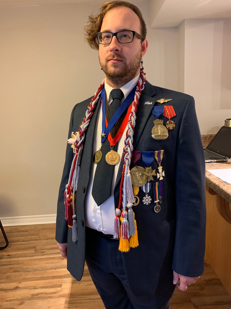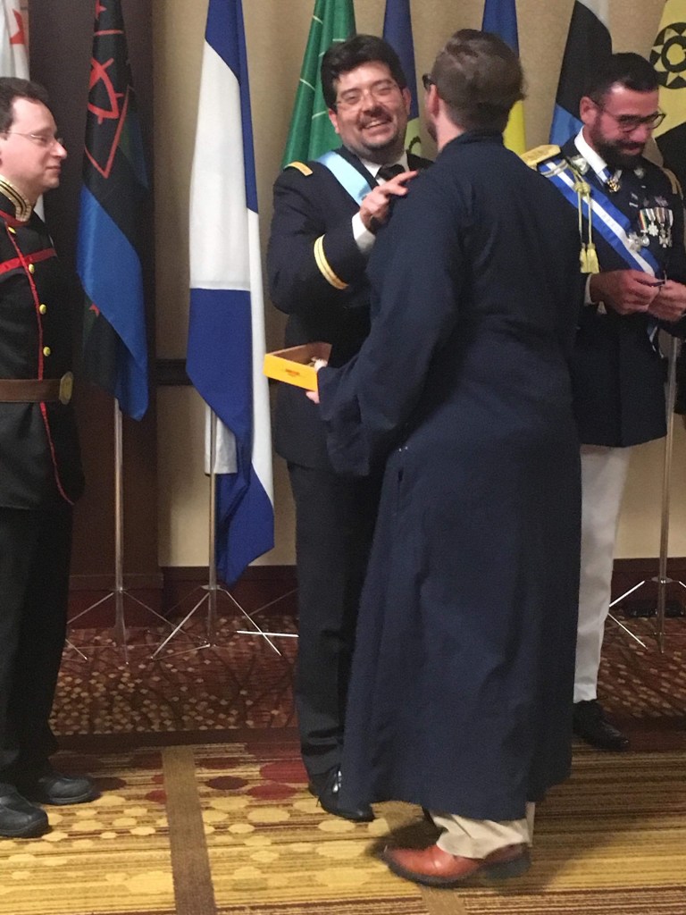After the dinner, an awards ceremony began with ten nations giving awards to many in the audience. The Sôgmô awarded six people the Sandum decennary medal, designed by Dominic Desaintes, and presented three commendationes to Slabovians King George 2.0 and Chancellor Rankin MacGillivray and to Party Secretary Adam Camillus von Friedeck. von Friedeck also received an ovatio, a Latin poem written in a Sapphic stanza. The Sôgmô recited the poem, which describes the Party Secretary’s commitment to decolonisation and to history, both in Latin and in English. The poem also received the attention of Aerican Julie Golick, a medievalist by training, who congratulated the Sôgmô on the latinity of their poem.