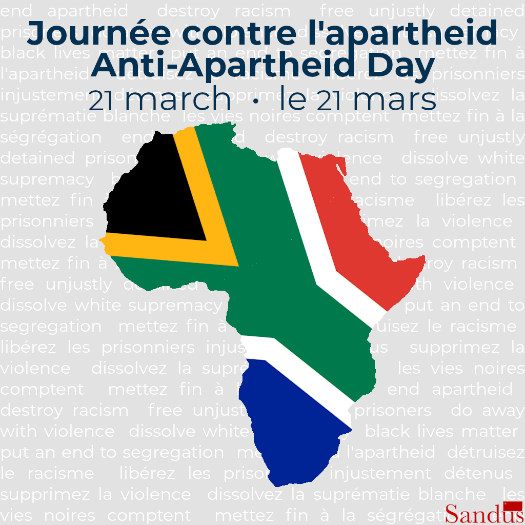 The poster for the holiday shows the African continent in the colours of an askew South African flag over a sombre textual background. The text on the back bears various slogans in English and French: “End Apartheid,” “Destroy Racism,” “Free Unjustly Detained Prisoners,” “Do Away with Violence,” “Dissolve White Supremacy,” “Black Lives Matter,” and “Put an End to Segregation.”