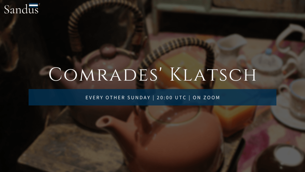 After years of citizen input and the idea being floated, the Sôgmô has announced the formation of a Sandum discussion and reading group, known as the « Comrades’ Klatsch ». The name refers to a social discussion meeting for coffee common in Germany-speaking countries, where the social institution is known as a Kaffeeklatsch. The « Comrades’ Klatsch » may or may not feature coffee since the meeting will occur every other Sunday at 20:00 UTC, a time that may be too late for some folks to reasonably drink coffee.