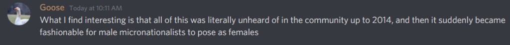 Some have defended Mar by claiming he didn’t know any better or saying that his culture makes it taboo for someone else, living thousands of miles away and in their own culture, to be transgender. As someone who subscribes to cultural relativism, even I find this a stretch. First of all, he certainly has been in the community since before 2014 when the first transgender micronationalists came out. (His history is wrong here, too.) It is now 2020 and, for someone so in touch with American and European micronationalists, I find it odd that his transphobia can be simply excused as “he is Russian.” I have news for him too: there are trans people in Russia, too.