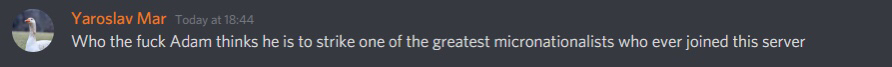 Of all of the points the convention raises, however, they all read a little differently to one who knows the context. They ring a little empty knowing Yaroslav Mar wrote them, especially to someone who has heard how his close friend and confidant Denys Tezdzhan-Smahin threatened to bring litigation in US court against another younger micronationalist because she used his publicly accessible picture on a micronational blog—all on the rather extreme interpretation that she stole his intellectual property. Rather then resort to closed door diplomacy, he had others make his threats for him. When it comes to ‘cancel culture,’ you only need to look back to May of this year when Denys Tezdzhan-Smahin wanted to cancel me for giving an opinion on my (professional!) field of Roman history and his use of it for his micronation.