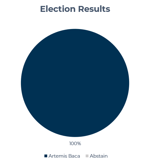 Artemis Baca has been elected Speaker of the Council, the first to hold such a post. She was elected with 100% of the votes cast, and one ballot had to be discounted because of an incorrect random identifying string. Voter turnout was 50%, though, since this includes inactive citizens, the participation of active citizens is likely higher.