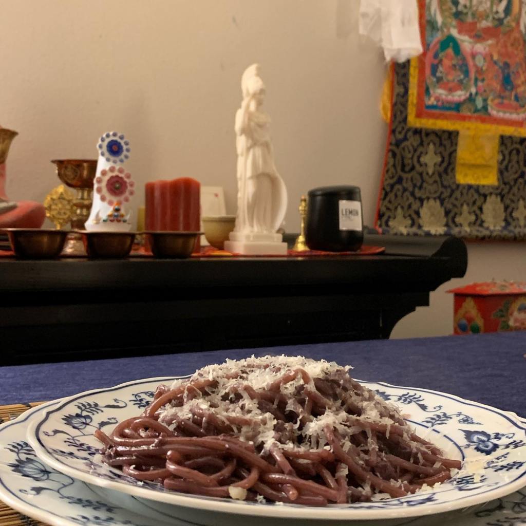 The holiday featured a many course dinner with appetizers, a pasta course, a main course, and a dessert. The dinner took the form of a sellisternium, a type of banquet ritual where the god or gods of a particular festival eat with banqueters in chairs (in sellis). In Quercus Candida, this was done by adjoining the Sôgmô’s dining table to their altar. The menu featured: fresh local baguettes with mozzarella, olives, dolmadakia, and roast pepper escalivada for the appetizers; red wine spaghetti for the pasta course; cottage pie for the main course; and a truffle bomb cake for dessert. Wines, whiskey, and other spirits were served in a variety of preparations.